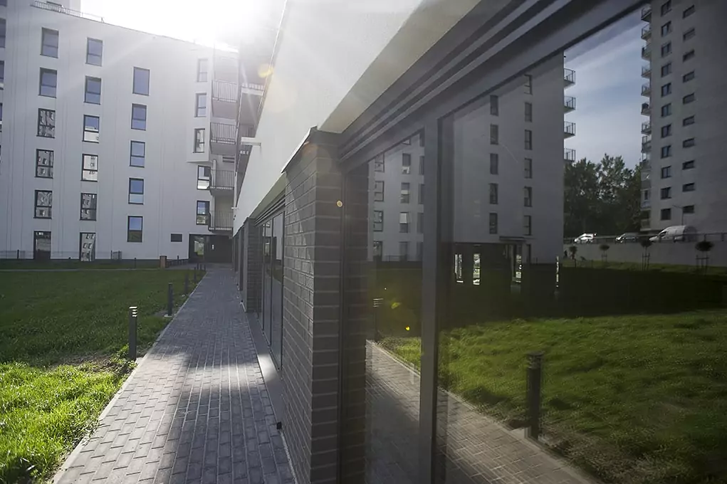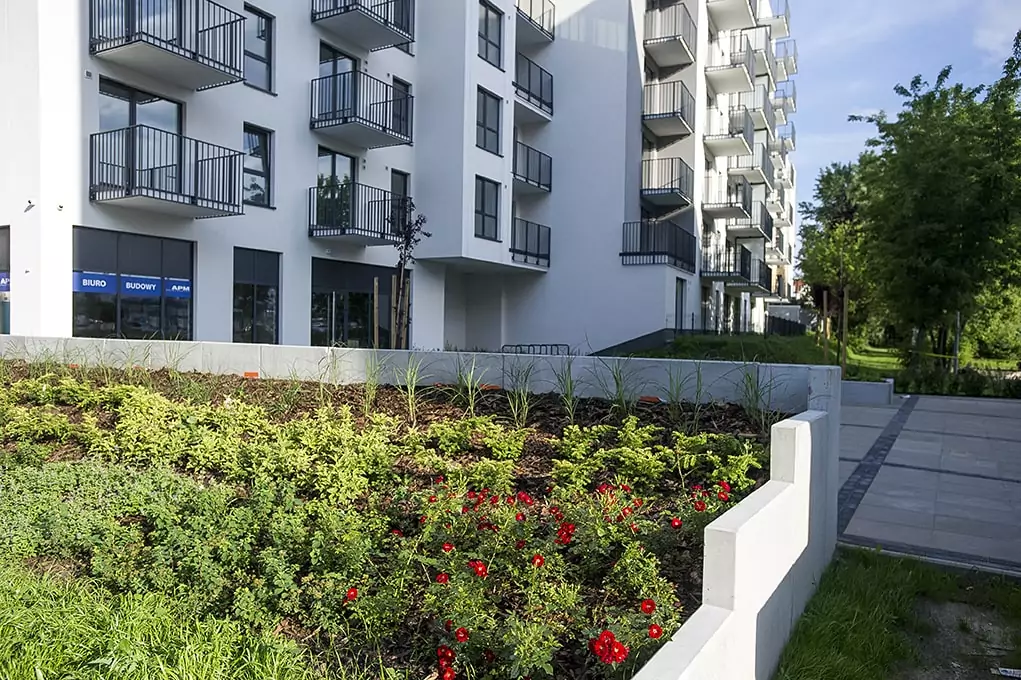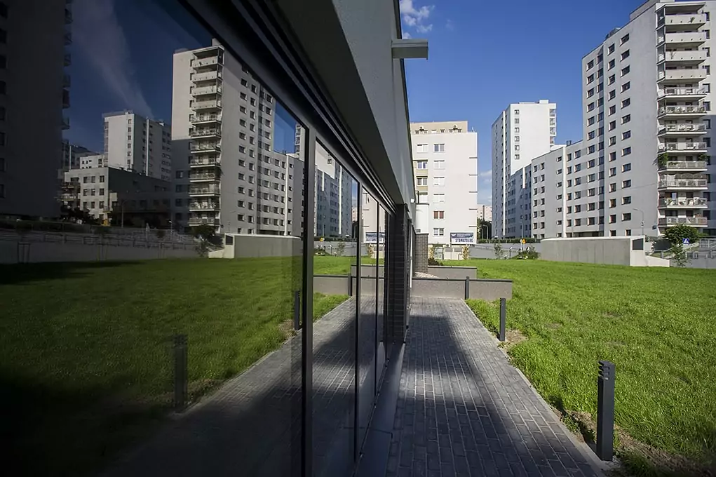 Na parterze znajdują się tu lokale usługowe, które zapewniły rozwój osiedla w jego własnej przestrzeni. Między budynkami Osiedle Bemowo zaprojektowaliśmy patio do użytku przyszłych mieszkańców, na którym znalazły się również ogródki przynależne do lokali gastronomicznych, dzięki czemu latem miejsce to tętni życiem.