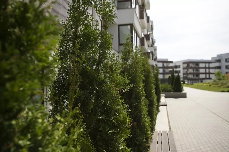 Teren między budynkami został zagospodarowany w konwencji mini parku. Głównym elementem wewnętrznego dziedzińca jest przestronny plac zabaw dla dzieci. Całość dopełniają alejki wyłożone kostką dekoracyjną oraz specjalnie dobrane elementy małej architektury takie jak: stylowe ławki parkowe, subtelne oświetlenie terenu i klomby z ozdobną roślinnością.