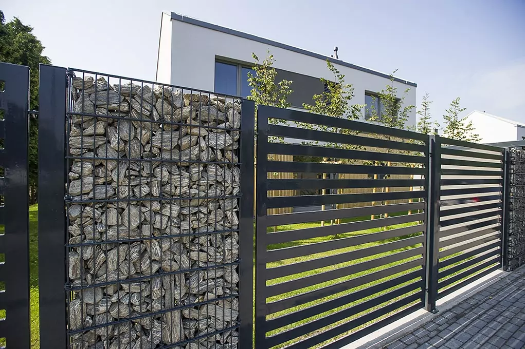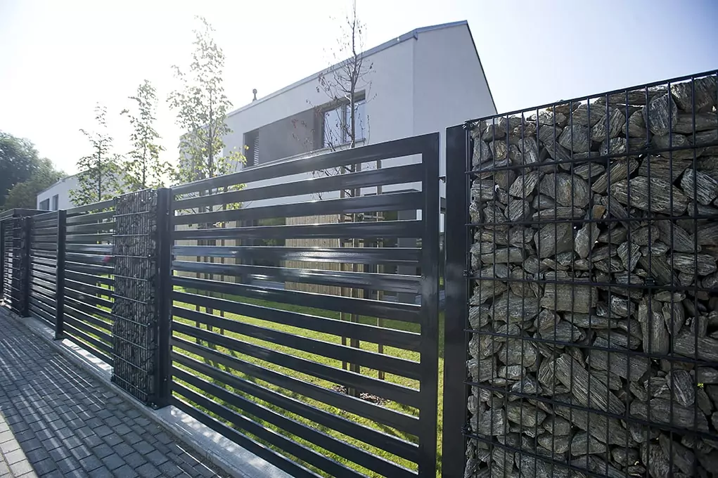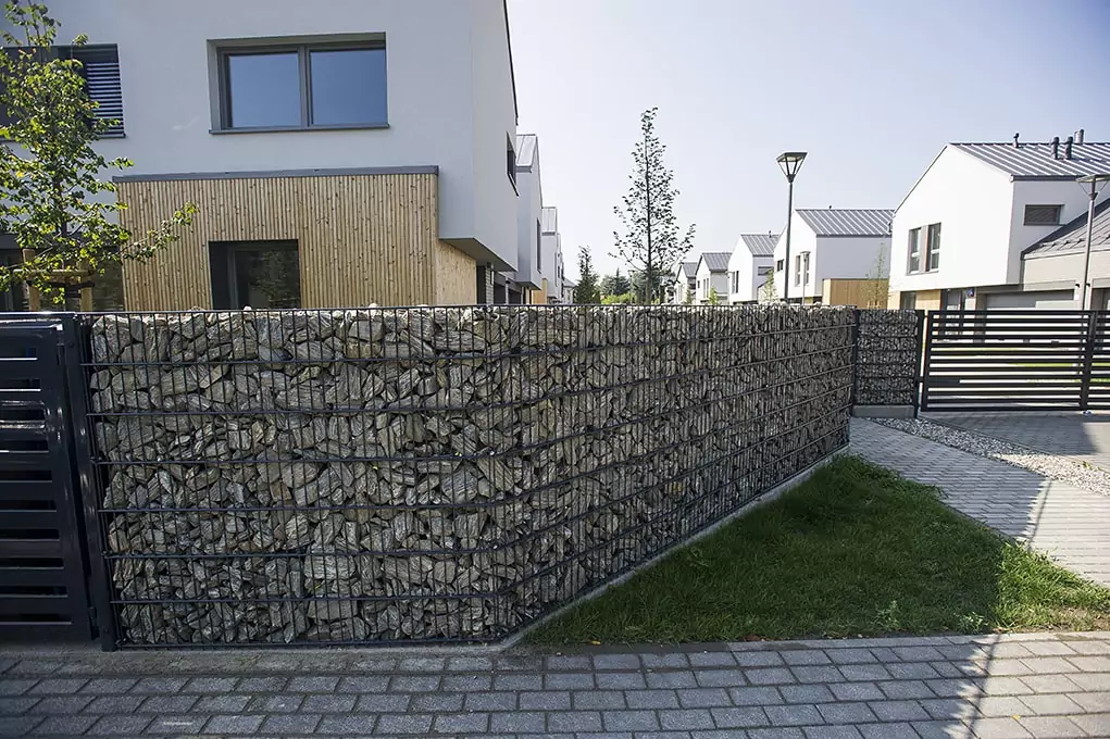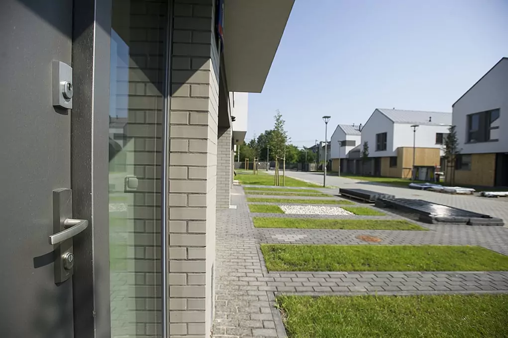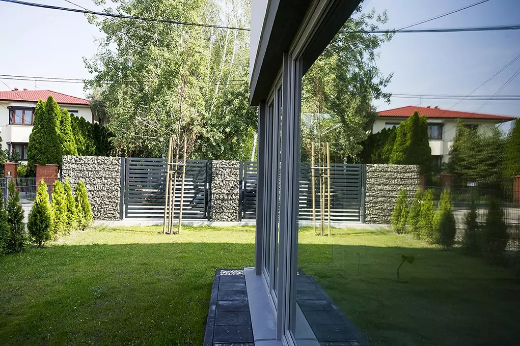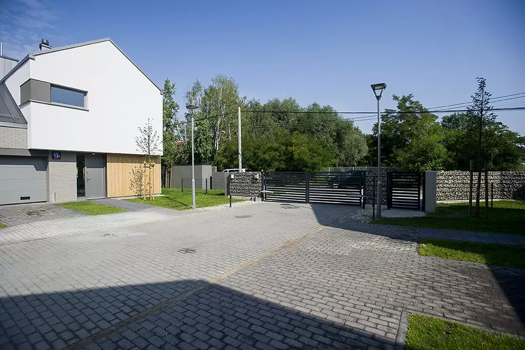 Dodatkowo stworzyliśmy alejki z ozdobnej kostki, a przy nich dekoracyjne latarnie. Całość została otoczona eleganckim ogrodzeniem i przystosowana do całodobowej ochrony.